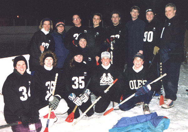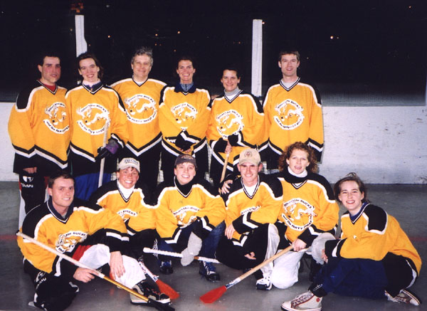 Both the Sheep and Brutality were undefeated in their league in 1999 and both won their league trophies with an amazing total 56-5 goal differential! The Sheep were 5-0 and Brutality was 4-0-1 with the heated game that was called a tie at the half against Ron's Auto out on Lake Nokomis. The playoffs were canceled in 1999 due to warm weather. This was the first year of an organized scrimmage at Breck against another team: the Lemmings. We had a hard time adjusting to the indoor ball and only scored 1 goal total for the two scrimmages. We didn't enter the state tournament this year.